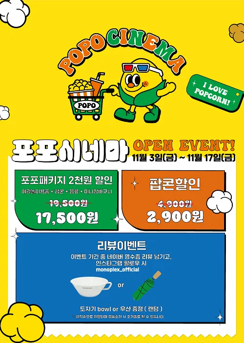 포포시네마는 오픈 기념으로 11월 3일부터 11월 17일까지 다양한 이벤트를 진행하며, 자세한 내용은 공식 인스타그램 및 홈페이지를 통해 확인 가능하다. 방문시, 홈플러스 김포풍무점 주차장을 무료로 이용할 수 있다.