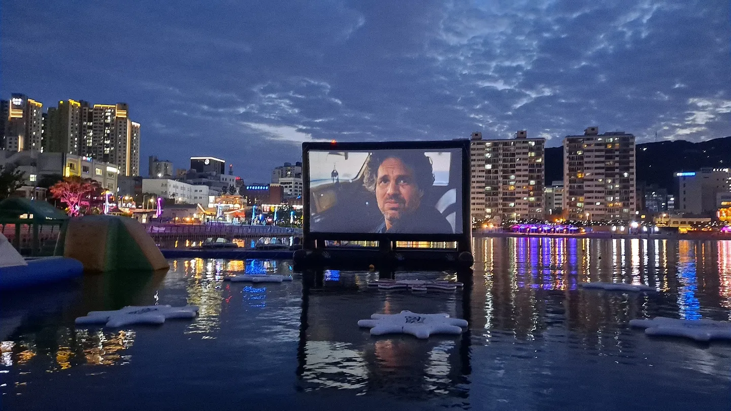 국내 최초 바다 위에서 보는 야외 영화관 SEA네마 물 위에 떠 있는 스크린에서 영화를 즐길 수 있는 수상 영화관으로